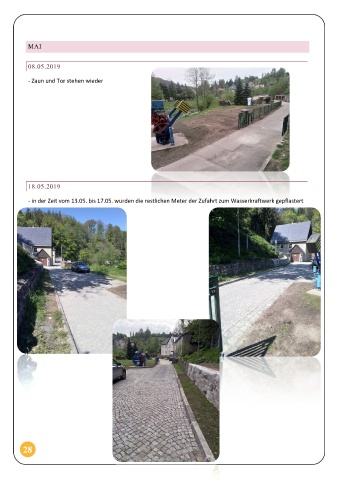 MAI 08.05.2019 - Zaun und Tor stehen wieder 18.05.2019 - in der Zeit vom 13.05. bis 17.05. wurden die restlichen Meter der Zufahrt zum Wasserkraftwerk gepflastert 28