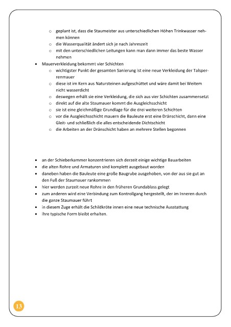 o wichtigster Punkt der gesamten Sanierung ist eine neue Verkleidung der Talsper-