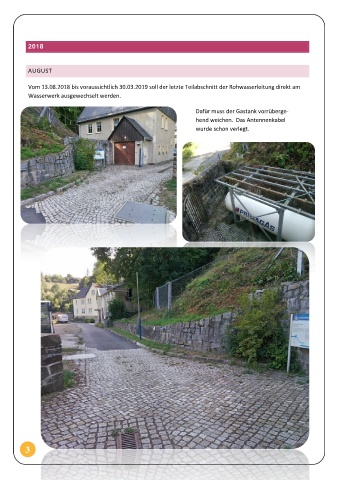 2018 AUGUST Vom 13.08.2018 bis voraussichtlich 30.03.2019 soll der letzte Teilabschnitt der Rohwasserleitung direkt am Wasserwerk ausgewechselt werden. Dafür muss der Gastank vorrüberge- hend weichen. Das Antennenkabel wurde schon verlegt. 3